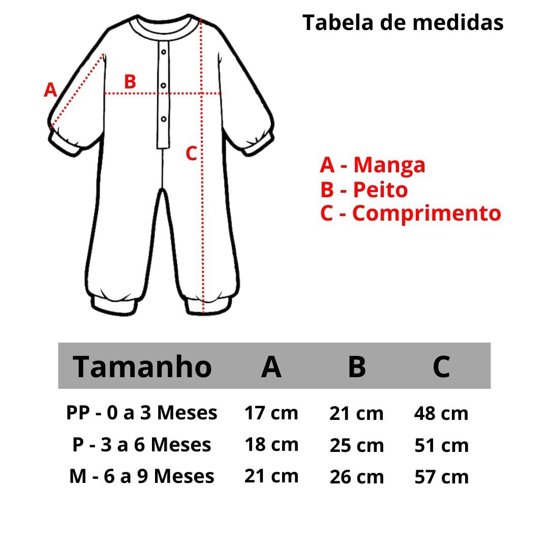 O macacão possui modelagem confortável, com abertura frontal em botões de pressão, facilitando na hora de vestir e nas trocas. A peça se destaca pelos delicados bordados de mariposas, que trazem um charme especial, além da gola clássica e punhos com detalhe em rendinha, deixando o conjunto ainda mais delicado.
